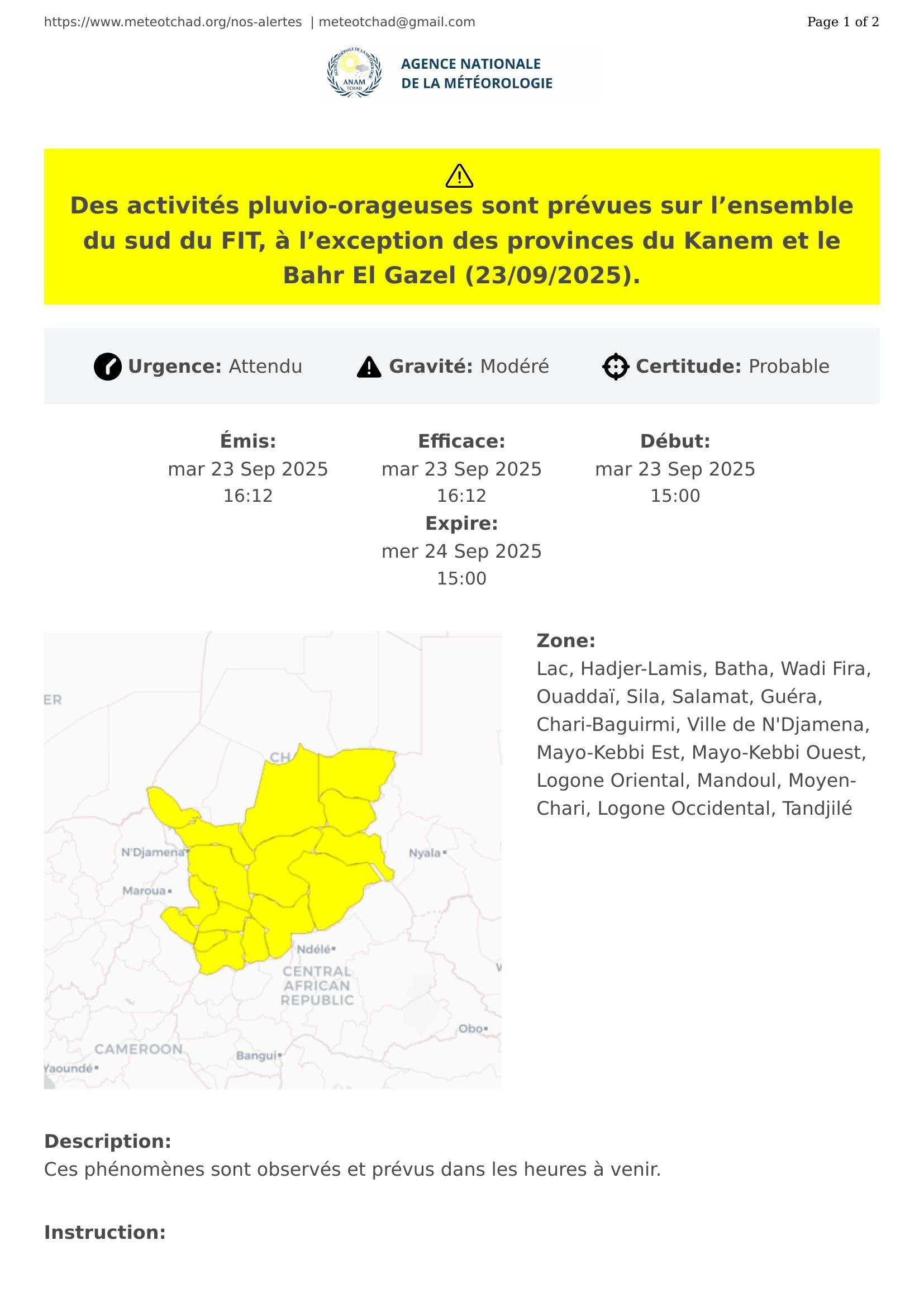 Des activités pluvio-orageuses sont prévues sur l’ensemble du sud du FIT, à l’exception des provinces du Kanem et le Bahr El Gazel (23/09/2025).
