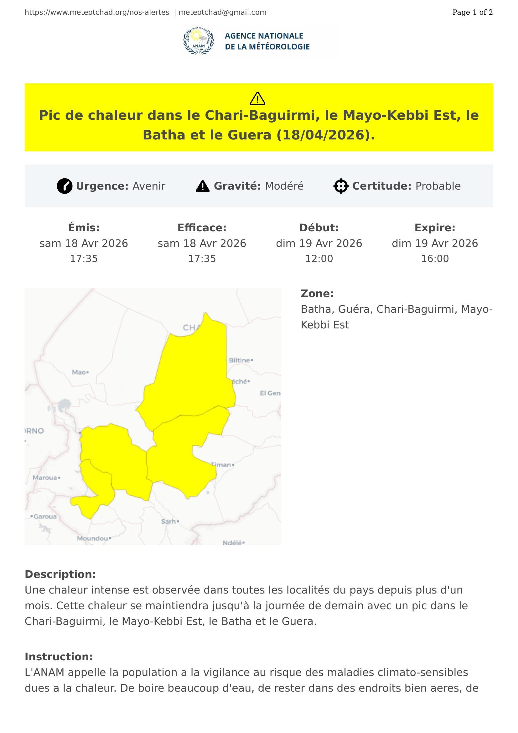 Pic de chaleur dans le Chari-Baguirmi, le Mayo-Kebbi Est, le Batha et le Guera (18/04/2026).